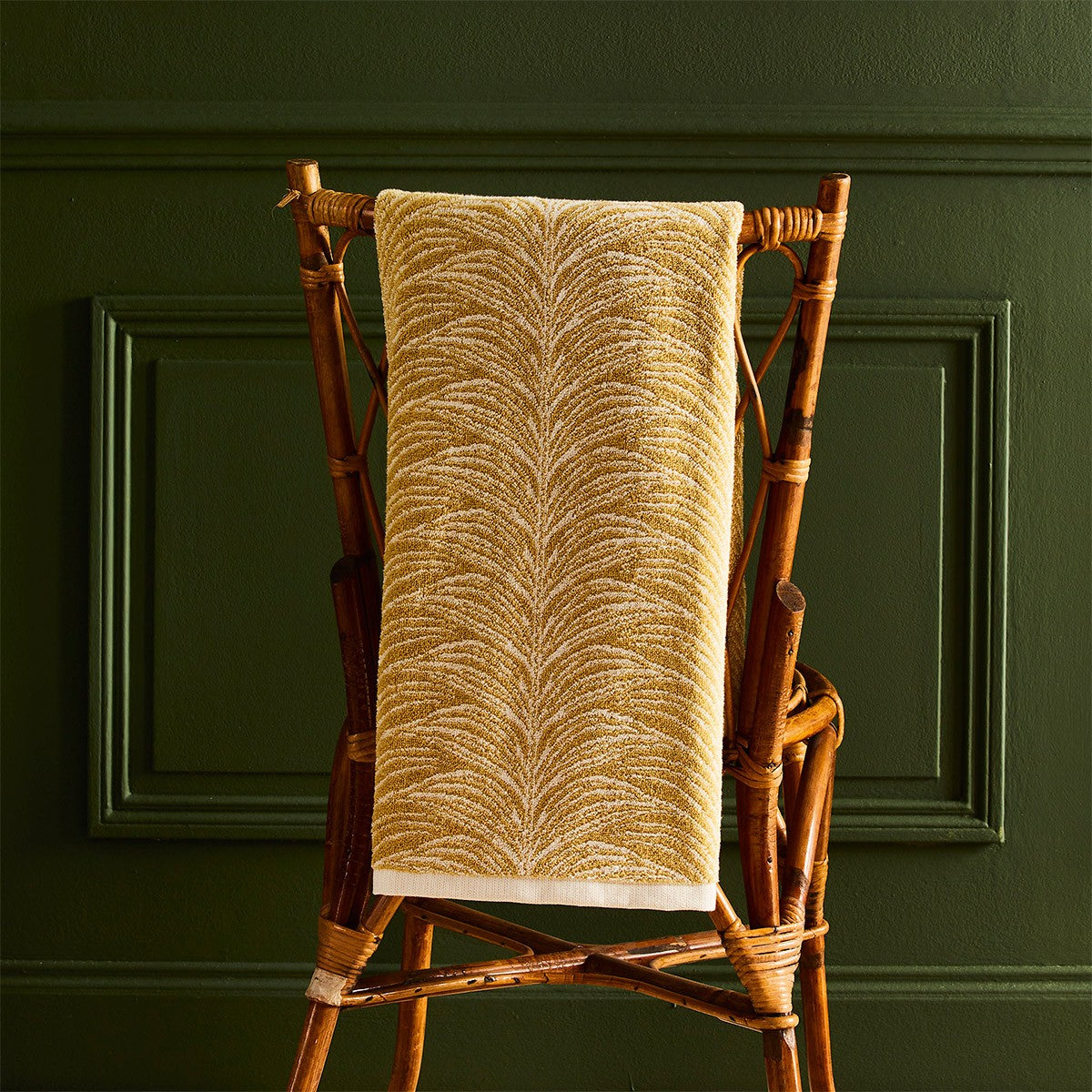 Hazel blossoms scatter their pollen in subtle plays of light across the terry cloth, creating a natural and graphic motif that brings a poetic touch to the bath space.
